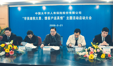 2008年2月21 日,太保壽險召開“學英雄熊大勇,饋客戶送真情”主題活動啟動大會,壽險公司經營委員會執行委員、銷售總監鄭韞瑜在會上作了動員和布署,要求廣大營銷員和 客戶服務專員積極行動起來,不僅要學習熊大勇同志忠于保險事業、忠于人民、客戶至上的高尚品德,更要以他平日樂于奉獻、把客戶利益放在首位的先進事跡為楷 模,將點點滴滴的感恩和關愛滲透在每一次為客戶服務的具體過程中,充分發揮業務一線人員的橋梁紐帶作用,以學英雄送關愛的具體行動再一次向全社會展示太平 洋壽險誠信天下、穩健一生、追求卓越的品牌形象。