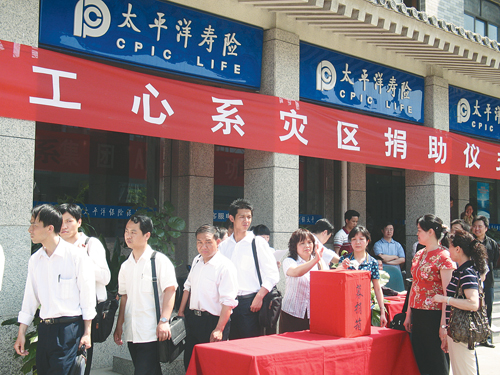 “一手抓保險理賠,一手抓業務發展”的工作要求,在全轄大力開展“眾志成城、愛心傳遞”活動。公司從所售保單中按一定比例提取資金籌集“太平洋壽險員工愛