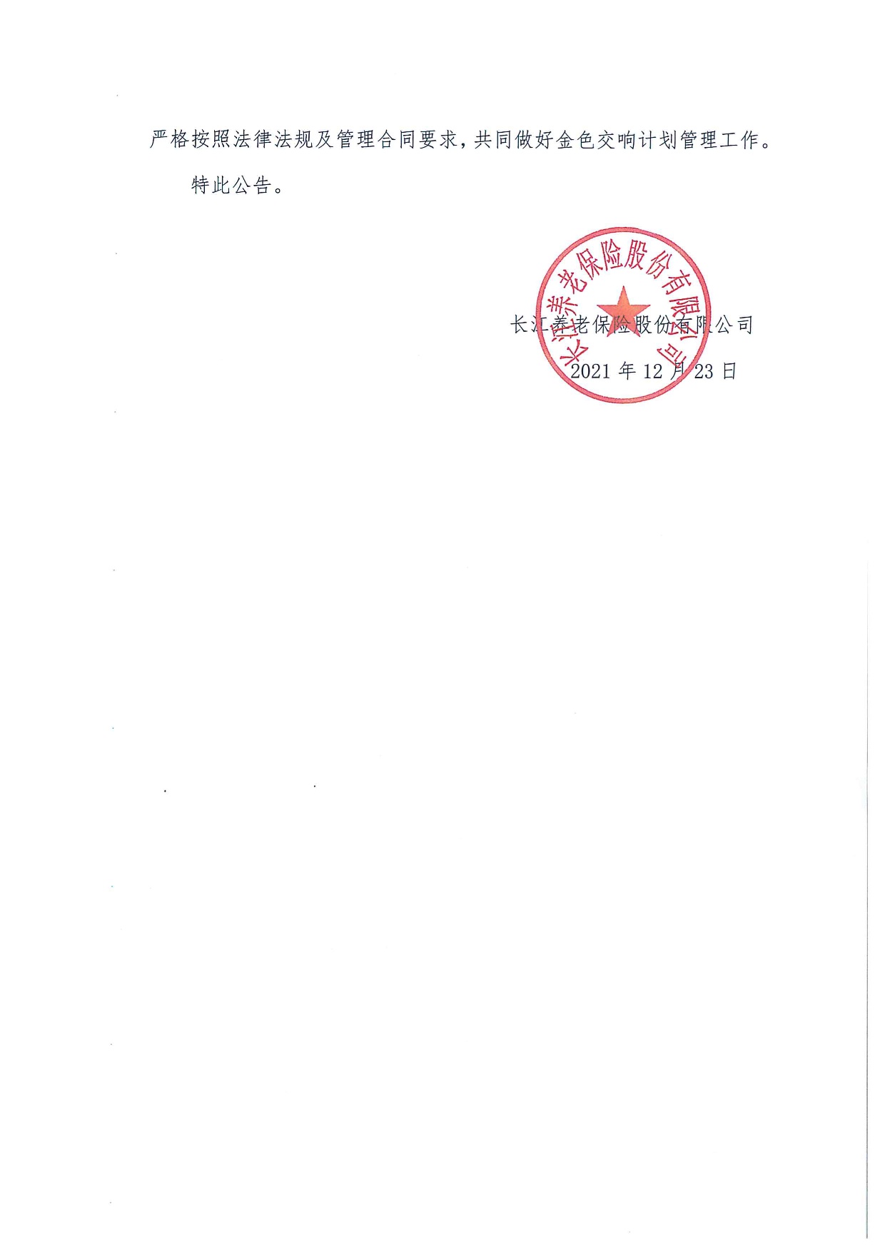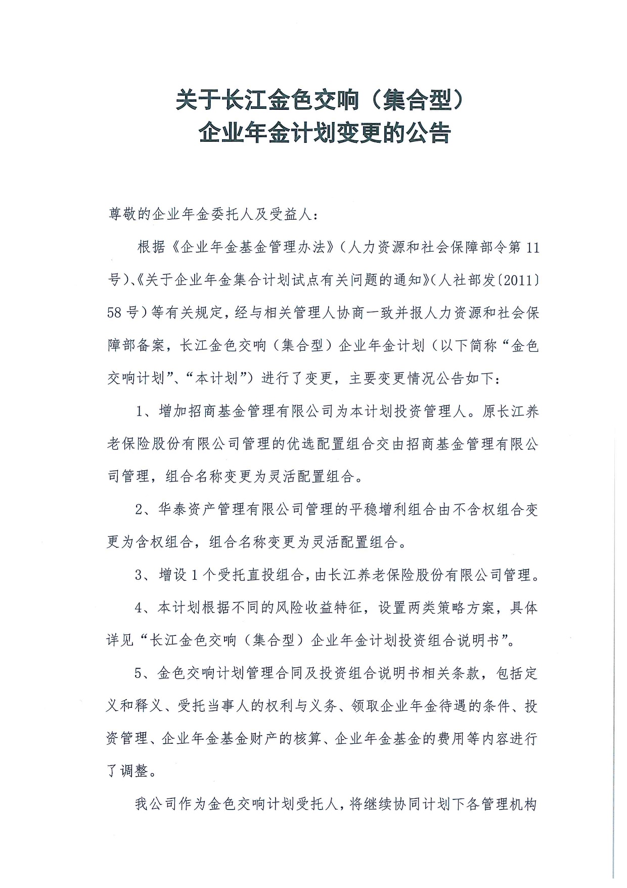 關于長江金色交響(集合型)企業年金計劃變更的公告(2021年12月)