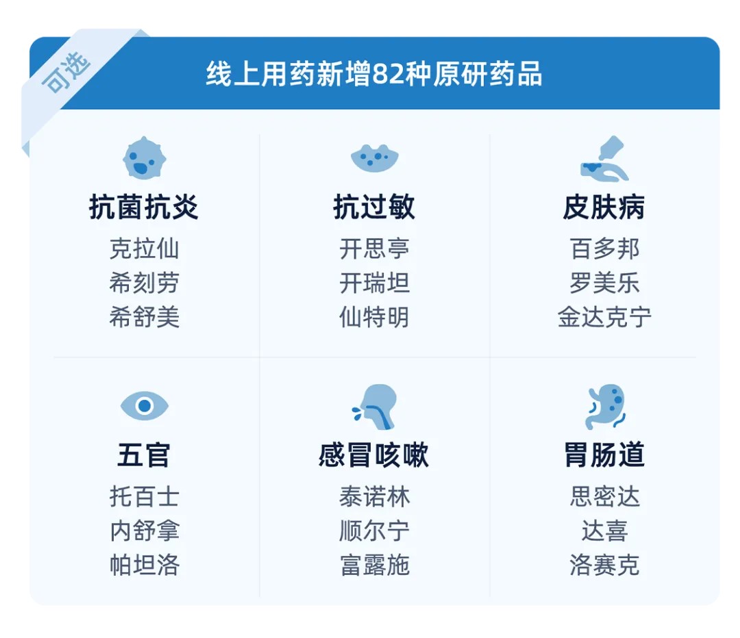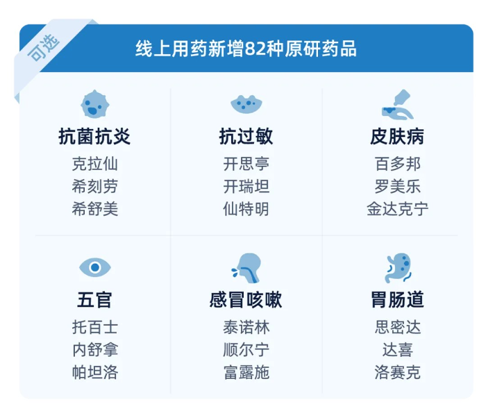 門診原研藥免費新增82種,療效更好,比如我們常用的希舒美、達喜、開瑞坦等,日常用藥品質直接拉滿。