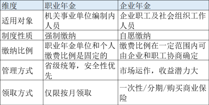 職業年金與企業年金雖然同屬我國養老保險體系的第二支柱,但兩者在適用對象、制度性質、繳納比例、管理方式以及領取方式存在不同,具體情況如下: