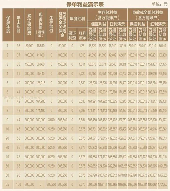 注:1.紅利分配分別按保證利益、紅利演示2種情況進行預測,僅作為參考之用。紅利演示不作為未來紅利分配的保證,實際紅利水平可能高于或低于表中所列數字;2.為了便于說明,假定合同生效日為1月1日;3.累積紅利的累積利率為1.75%,是假設值,公司每年公布的累積利率可能高于或低于該利率;4.以上演示的被保險人年齡、生存給付(包含祝福金、滿期金)為保單年度末且經過完整保單年度的值;5.現金價值(退保金)、身故保險金為保單年度末且經過品整保單年度的值,保單年度中的現金價值(退保金)、身故保險金可能高于或低于該數值,現金價值(退保金)不包含當年給付的祝福金及滿明保險金;6.萬能賬戶價值按照假設的結算利率計算,最低保證、結息演示兩檔的結算利率假設分別為1.0%(最低保證利率)、3.0%,萬能臉的最低保證利率之上的投資收益是不確定的,實際保單賬戶利益可能低于萬能結息利益演示水平;7.合同生效日對應日派發的相關利益計入上一保單年度末;8.演示數據保留整數。