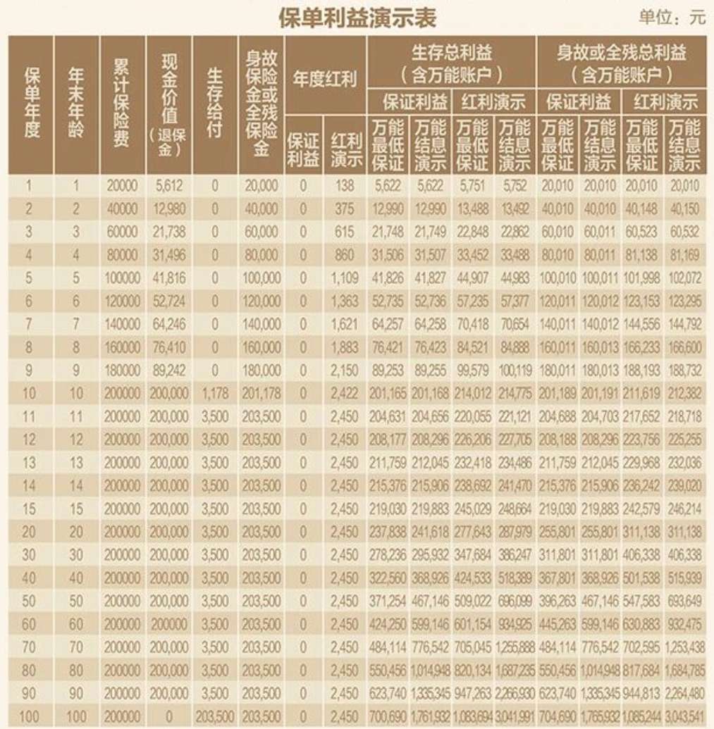 | 保單年度 | 累計保費 | 現金價值 (退保金) | 年度紅利 | 生存總利益(含萬能賬戶) | 身故或全殘總利益(含萬能賬戶) | |||||||